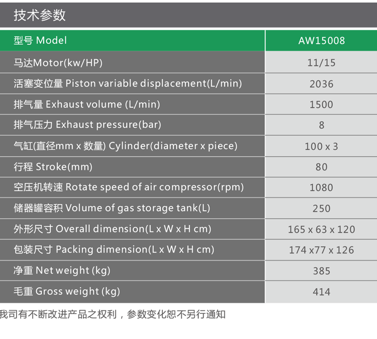產品名稱:11kW,8bar新型節能環保活塞式空壓機 AW15008